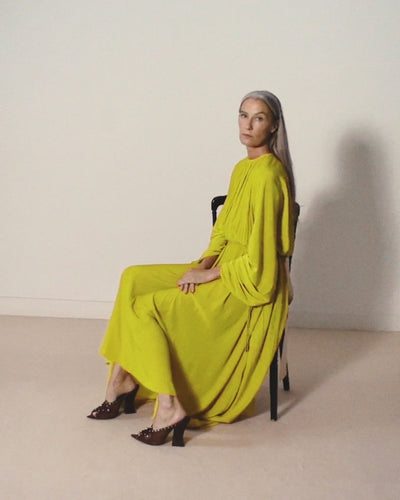 The Charmeuse fabric of this dress is distinguished by its finesse, fluidity and satin-like finish. These characteristics are achieved thanks to an ancient Japanese technique and the use of pure water during the manufacturing process. The gathers and high collar elegantly structure the silhouette for a sophisticated look that is suitable for both day and evening wear.