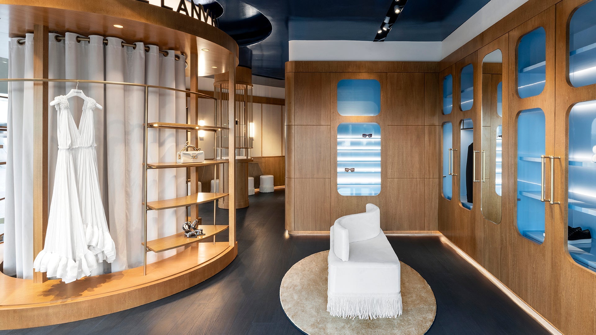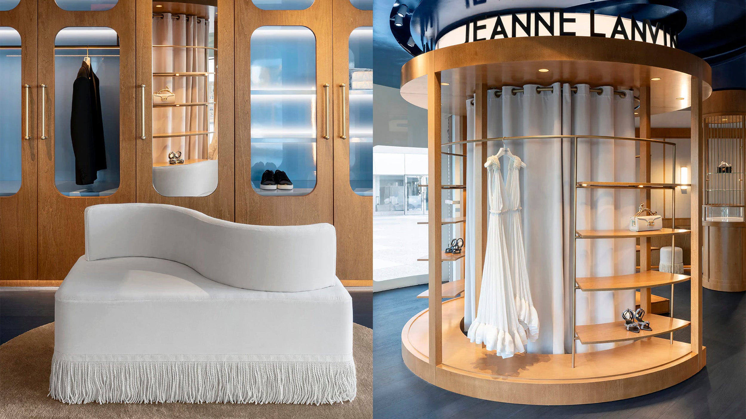 With a nod to Jeanne Lanvin’s staging of a couture presentation on board The Normandie in celebration of its first transatlantic voyage in 1935, the boutique will initially open as an ephemeral experience drawing architectural inspiration from the iconic ocean liner. Echoing the splendor of the vessel’s Grand Salon, the central area of the boutique signals the luxury of on-board shopping complete with the circular windows reminiscent of maritime travel.
