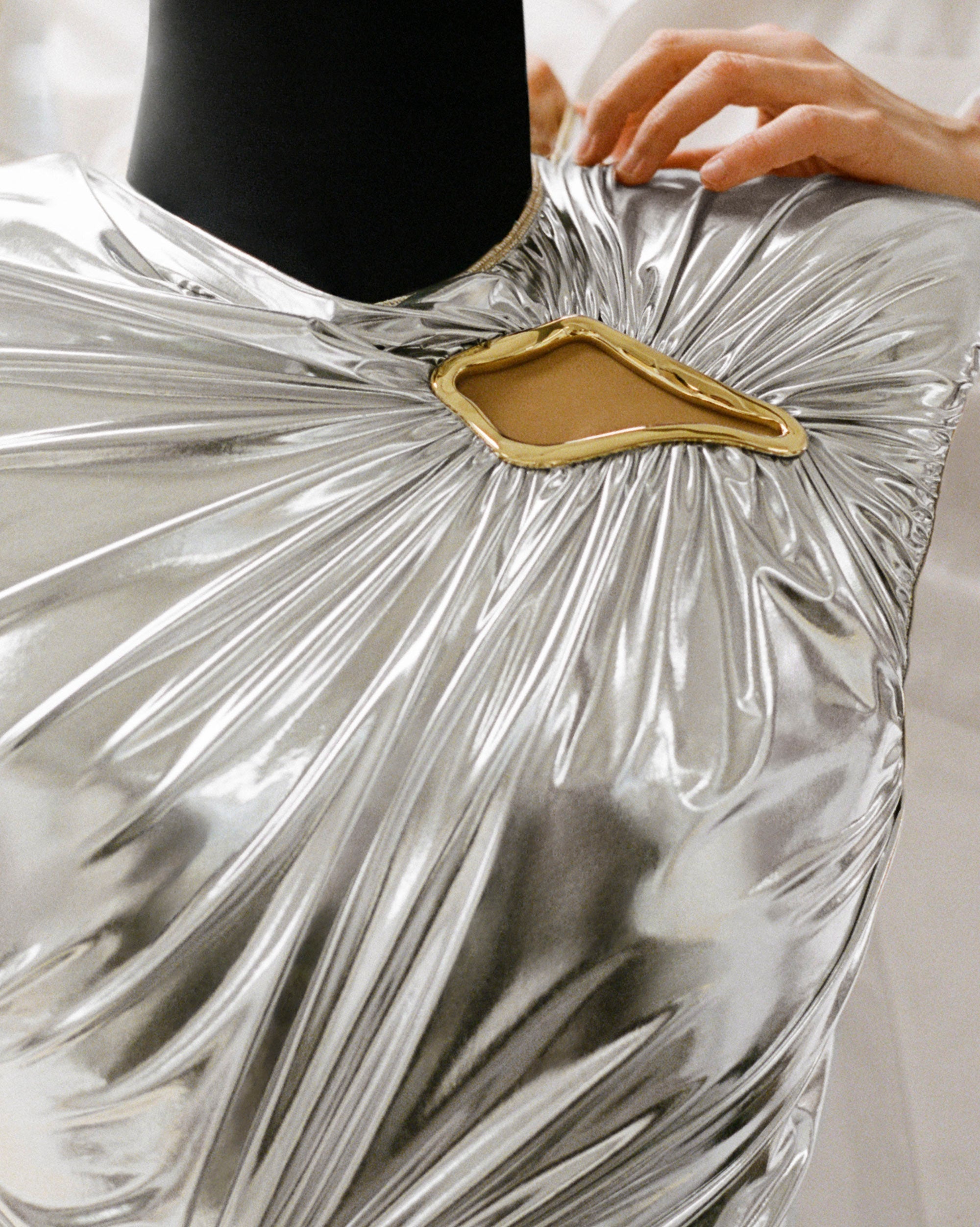 Each piece was handcrafted by the artisans and petites mains at LANVIN's Paris atelier. A single ensemble consisting of a leotard and cape required no less than 180 hours to create. The silver leotard features gold signature hardware which will be a key feature of the house’s forthcoming collections.